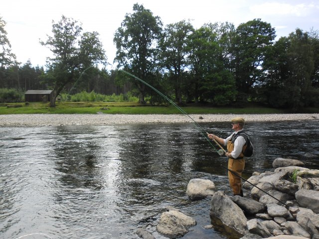 After the couple of rises in water we got last week I didn't think the river would have dropped away as quickly as it did but by Monday we were down to 3ins on Cairnton gauge so it was going to be quite a hard week unless we got more water. We did get an inch or so through the week but not enough to get things going however we did manage a 3lb sea trout from Upper Ferroch on Monday. Wednesday, Keith Collin's got a lovely 4lb grilse from Invercannie (pictured below) on a tiny tube of his own tying. Thursday Michael Wright landed what turned out to be our joint largest fish of the season at 16lb from Upper Ferroch (pictured below - Michael playing the fish) on a small brown turbo disk tube. So a long with that and maybe half a dozen good offers it wasn't a bad week but we need a good few days of rain before we'll get fish in any numbers.