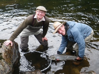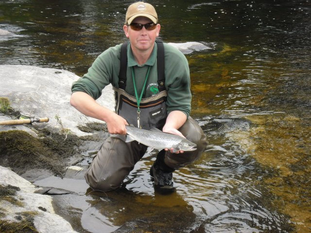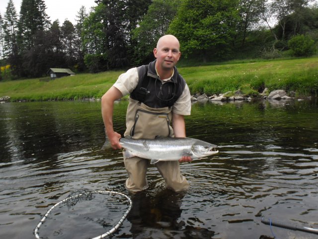 Well, we got the rise I was hoping for with the rain last Sunday so the river was 4ft 6in on Monday morning and not looking too good but we did get a fish of 7lb from Grey Mare and a 2lb sea trout from Middle Ferroch so it was a good start. Tuesday we blanked. Wednesday we got a 7lb fish from Grey mare & a nice 3lb sea trout from Rock Heads for Lee Craig - Ghillie on Carham,Tweed. (pictured below) Thursday we got three fish, the biggest being 14lb for Islamouth Ghillie Glenn Kedward from the Rock Heads. (pictured below) Glenn also got a 12lb licer from Invercannie, both on a size 10 cascade. Also our first grilse at 3lb was landed in Glisters & a sea trout from Upper Ferroch. On Friday we landed a nice 7lb fish in Upper Ferroch & that was it for the week.