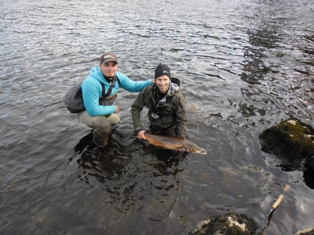 The river was sitting at 1ft 6in on Monday morning and within 5 minutes one of the rods had a fish of 12lbs from the Cottage which usually is the kiss of death (getting the fish so early), as it turned out it was, as we only managed 3 for the week. It was not without lack of effort however as we had a Swedish party who fished it very hard and one regular Cairnton rod who knows the water extremely well. He has been fishing the beat for years and could not understand why we were not catching more. The biggest fish of the week, 16lbs, was a lovely cock fish in it's autumn colours, caught by Mattias Helde in the Grey Mare (pictured below with his friend, Swedish casting champion Tellis Katsogiannos). With high pressure sitting on us and with the chance of a few frosts it will hopefully get them switched on.