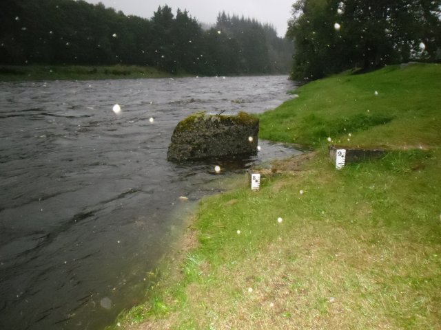 We started the week off with the river sitting at 11 inches on the Cairnton gauge and a hard frost in the morning but things quickly warmed up and what fish were there seemed to be a little bit more active. We managaed 1 fish from the Outer Colonel on Monday on a Red Francis tube and a Sea Trout from Invercannie on Wednesday, albeit 2 or 3 fish were hooked but lost. With the forecast for rain on Thursday evening and weather warnings in force we got the rise in water on Friday morning that we were not really needing as it rose to over 8 feet on the Cairnton gauge (picture below taken at 7 1/2 feet on the rise). Saturday it dropped back to 5 1/2 feet and was crystal clear which should have given us a reasonable chance with 1 or 2 seen but nothing taken. Maybe Monday will be a good finale.